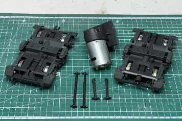 Beim Antrieb greife ich auf den Antrieb einer Märklin BR 218 zurück. Der Achsabstand dieser Lok stimmt exakt mit dem der E1200 überein, so dass ich die Drehgestelle perfekt verwenden kann. Der Motor treibt über Kardanwellen alle vier Achsen an. Ob die beiliegenden Kardanwellen dann auch für die Modellumsetzung passen, muss sich noch zeigen. Es wäre aber auch kein Problem, neue Wellen zu zeichnen und zu drucken.